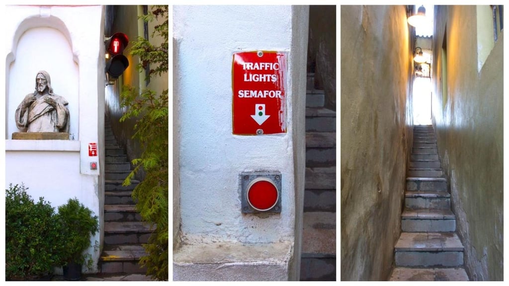 Die Gasse ist nicht nur so eng, dass nur eine "relativ schlanke" Person auf einmal passieren kann, sondern das hinauf und hinunter Gehen der Passanten wird durch eine Fussgängerampel geregelt. Wenn Du also sicher hinauf oder hinunter gehen möchtest musst Du per Druck auf den Ampelknopf das "grüne Männchen" anfordern.